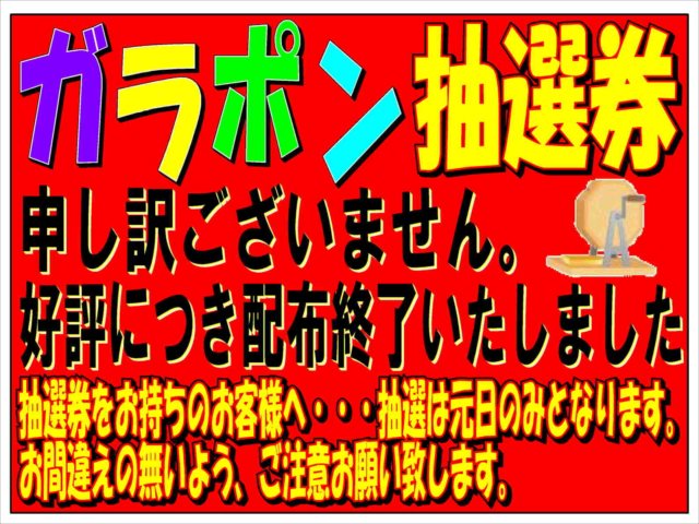 ガラポン抽選券の配布は終了してしまいましたが、抽選券をお持ちの方で抽選がまだの方は本日中にご来店くださ〜い〜(屮゚Д゚)屮カモォォォン